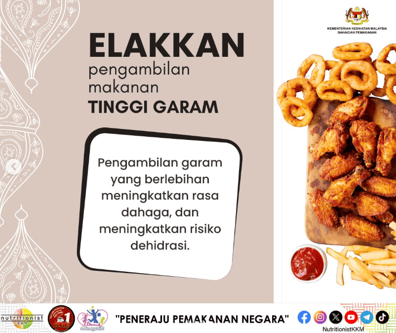 Dapatkan info terkini pemakanan sihat sempena Ramadan dan idea menu berbuka/sahur di portal rasmi Kementerian Kesihatan Malaysia (KKM) atau Facebook Nutrionist KKM untuk info pemakanan sihat.