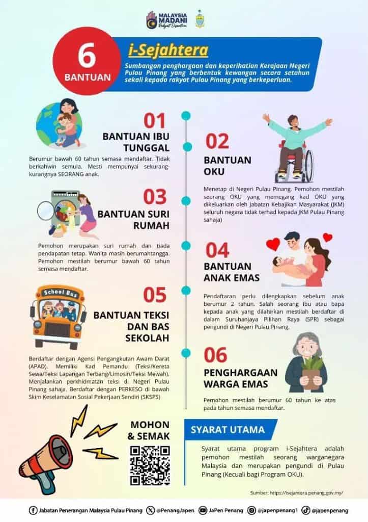 PROGRAM BANTUAN ISEJAHTERA UNTUK IBU TUNGGAL, WARGA EMAS, OKU, SURIRUMAH, PELAJAR DAN BAYI – Kerajaan Negeri Pulau Pinang memperuntukkan sebanyak RM50.93 juta bagi pelaksanaan Program i-Sejahtera Fasa 1 Tahun 2026, yang akan mula disalurkan bermula 7 Februari ini, dengan pembayaran dibuat secara Electronic Fund Transfer (EFT). Untuk info lanjut permohonan dan semakan, sila layari laman web rasmi https://isejahtera.penang.gov.my/
