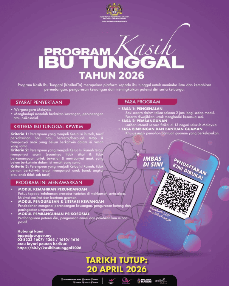 Untuk sebarang pertanyaan dan maklumat lanjut, sila layari portal rasmi Jabatan Pembangunan Wanita di pautan: https://bit.ly/kasihibutunggal2026