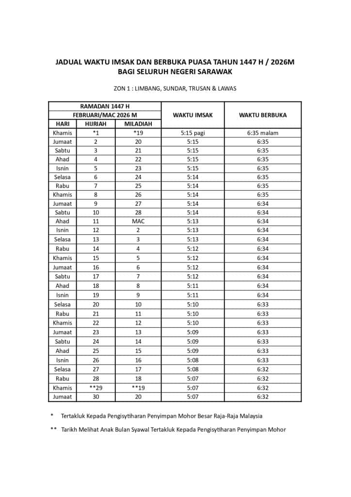 JADUAL WAKTU IMSAK & BERBUKA PUASA SARAWAK BAGI TAHUN 1447 H / 2026